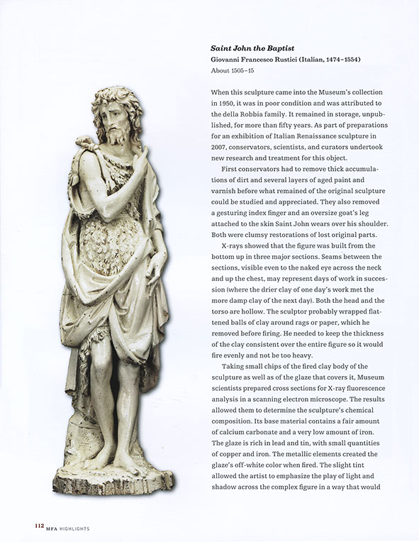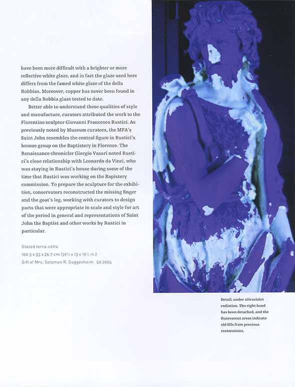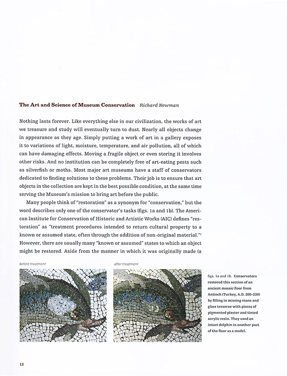 the design. The Solution To ensura a consistent look we used InDesign to create an exact replica of the Museum's existing Quark templates. These books have a very complex grid system to accomodate a variety of text and image combinations. Next, we composed the type (in galleys) for the book Conservation. Designer Lucy Hitchcock created the page layouts, and files came back to use for editoral corrections. After the first book was complete, we delivered InDesign files to use as an example for future books, including all necessary paragraph and character styles. We also provided on-site InDesign training sessions with the Museum's design staff. In addition to Conservation, we continue to compose type for occasional books in the MFA Highlights series, as well as exhibit catalogs. FINE ART BOOKS