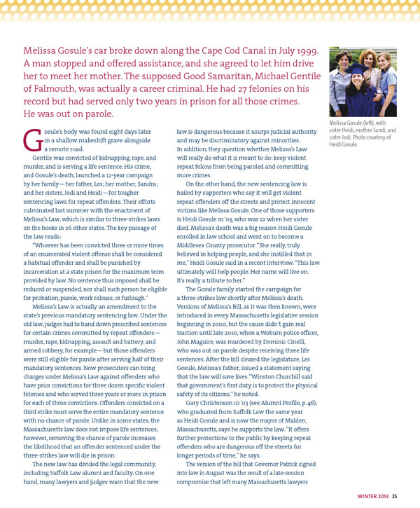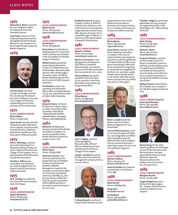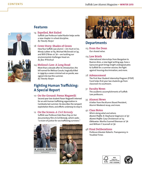 MAYERCHAK + COMPANY GRAPHIC DESIGN PRODUCTION EXPERTS DESIGN + PRODUCTION The Client Suffolk University Law School, Boston The Project Annual alumni magazine, 52 pages The Challenge Suffolk University had just established new guidelines for their rebranding campaign, and wanted to redesign their alumni magazine to work wtihin the new brand identity. This was the first publication to be created using the new branding. The Solution Suffolk Law School hired us to design and produce the magazine. We took care of all aspects of design & production, including cover design, interior pages, stock photo research, illustration. We also did the Photoshop color correction on alumni photos, and coordinated printing.